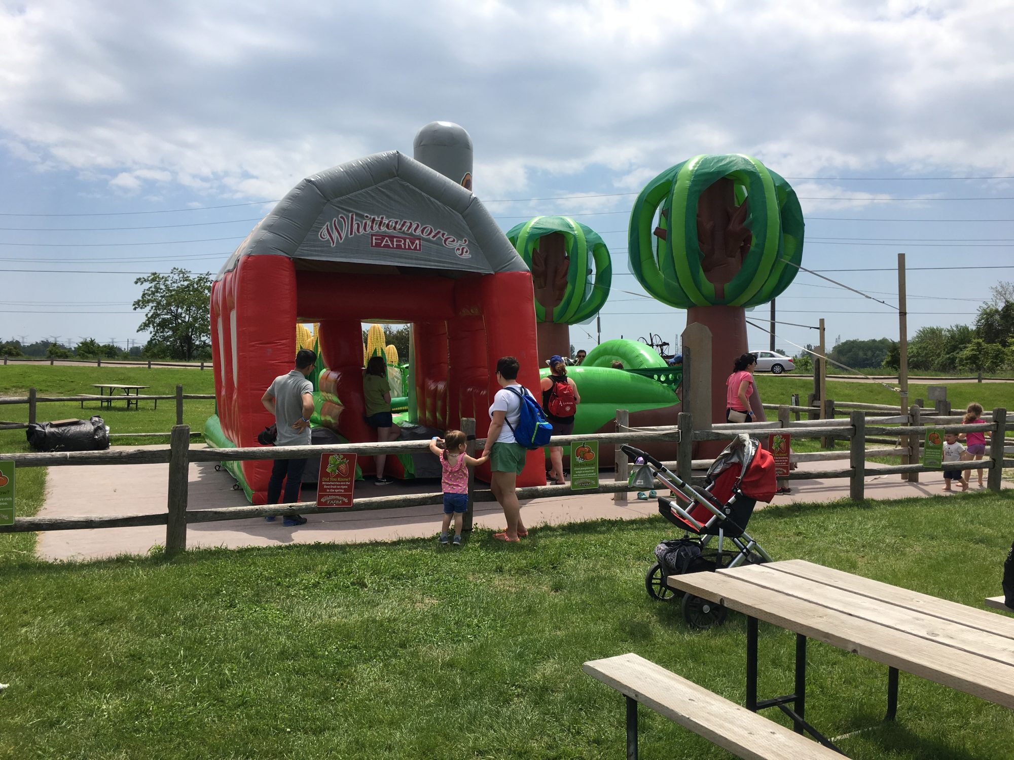 - This is a rectangular bouncer of custom design. There is an inflatable barn and pop-ups in the motifs of produce and livestock and 2 large inflatable trees